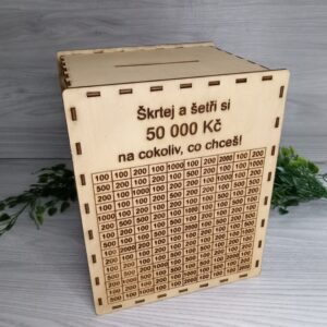 Originální pokladnička „Škrtej a šetři si 50 000 Kč“ (s možností vlastního textu)