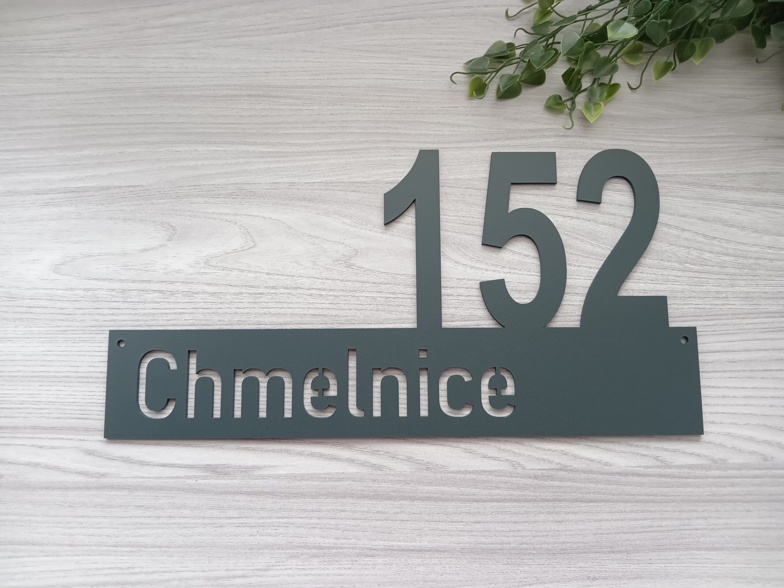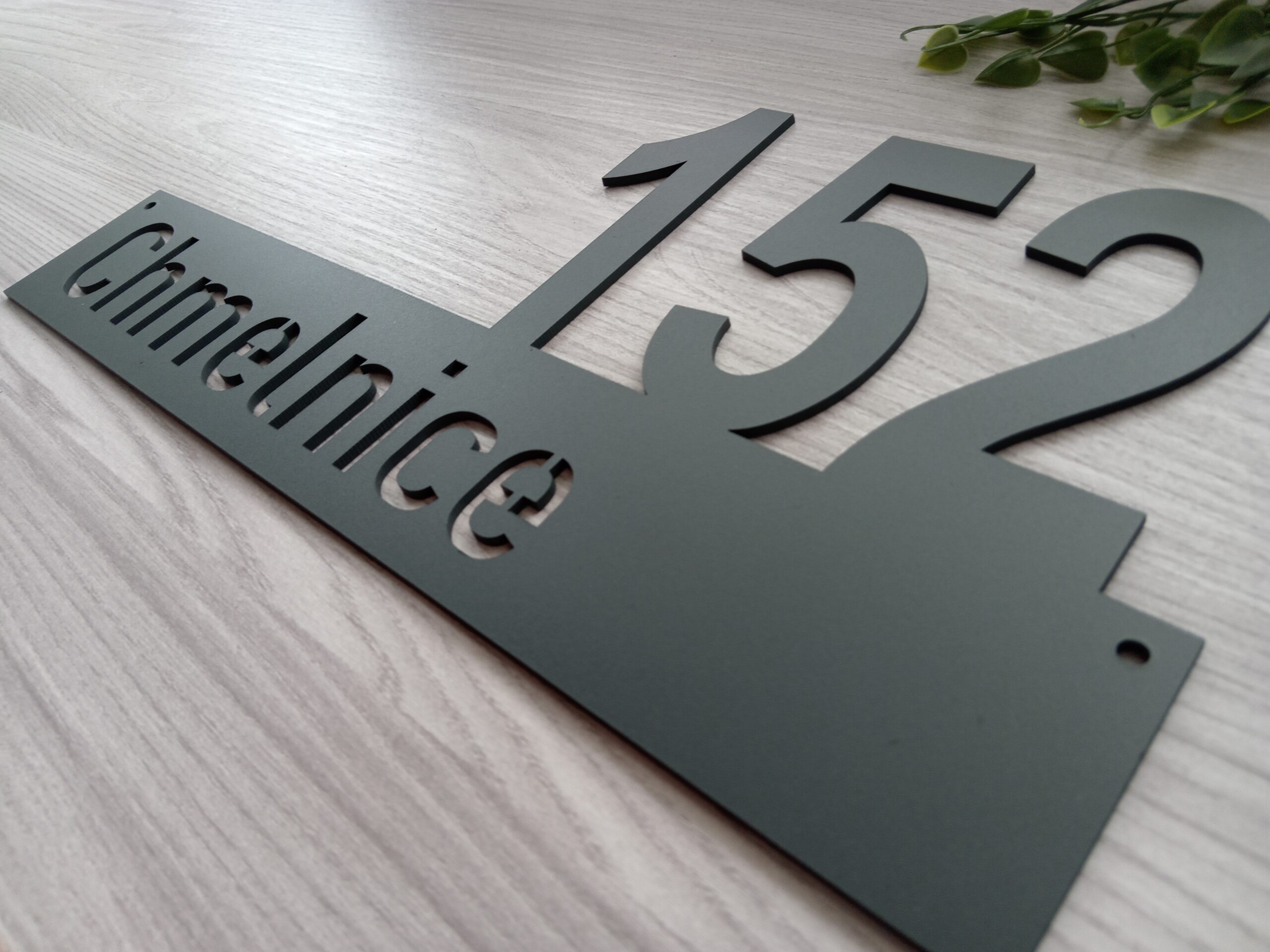Anthrazitfarbene Hausnummer mit Wunschtext.