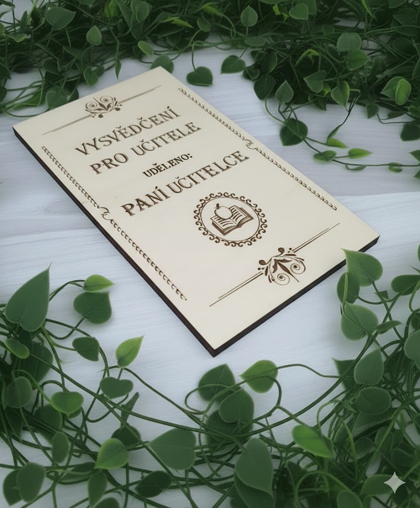 Originální poděkování – Hledáte netradiční dárek pro paní učitelku na konci školního roku nebo ke Dni učitelů? Toto dřevěné vysvědčení je skvělým způsobem, jak vyjádřit vděčnost s elegancí a stylem.