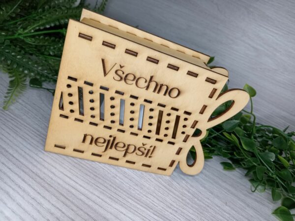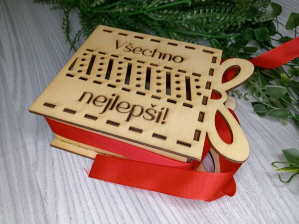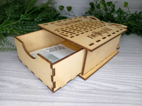 Dřevěná krabička na peníze darujte peníze nebo malý dárek opravdu originálně? Tato dřevěná krabička vám to umožní! Na víčko vygravírujeme libovolný text podle vašeho přání – může to být jméno, přání, datum nebo krátký vzkaz. Díky tomu se krabička stane nejen praktickým obalem, ale i jedinečnou vzpomínkou, která zůstane obdarovanému napořád.
