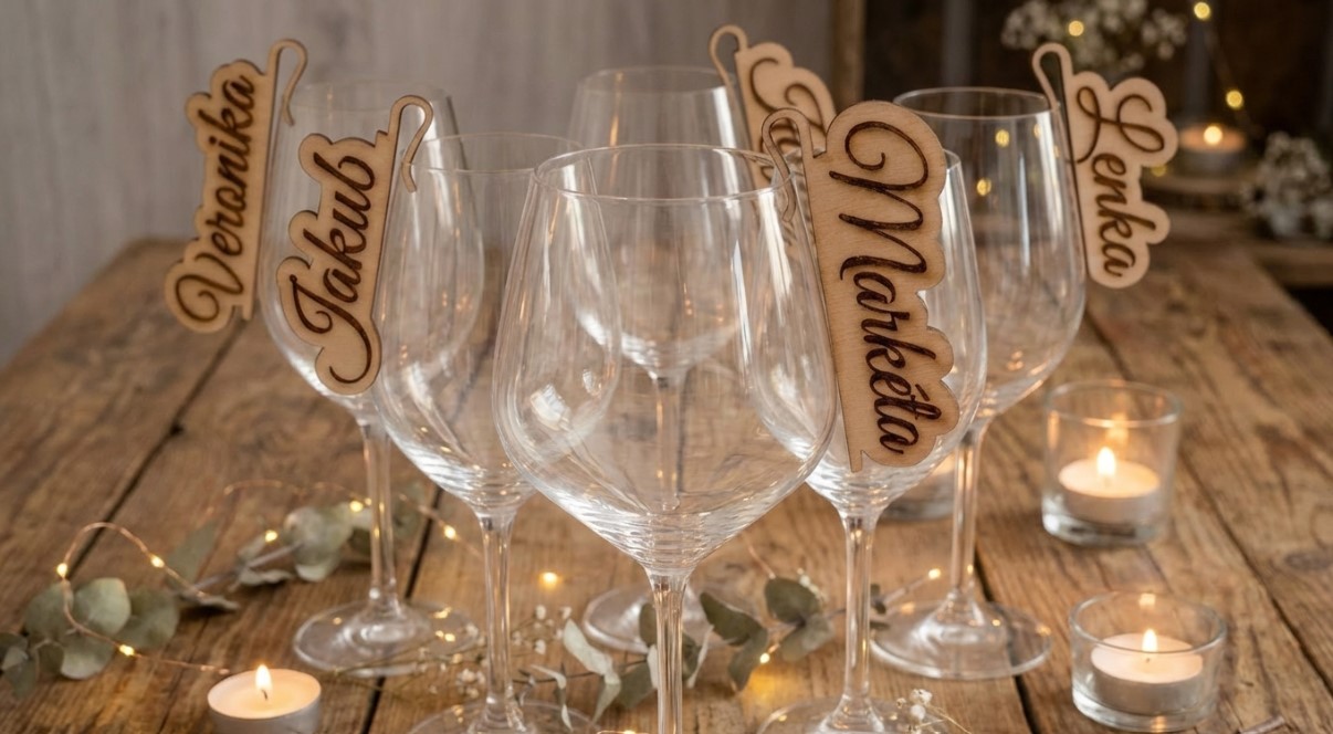 Dřevěné jmenovky jsou ideální pro páry, které ladí svatbu do přírodního, boho nebo rustikálního stylu. Jsou lehké, nepřevažují sklenice a vypadají skvěle na fotografiích svatební tabule.
