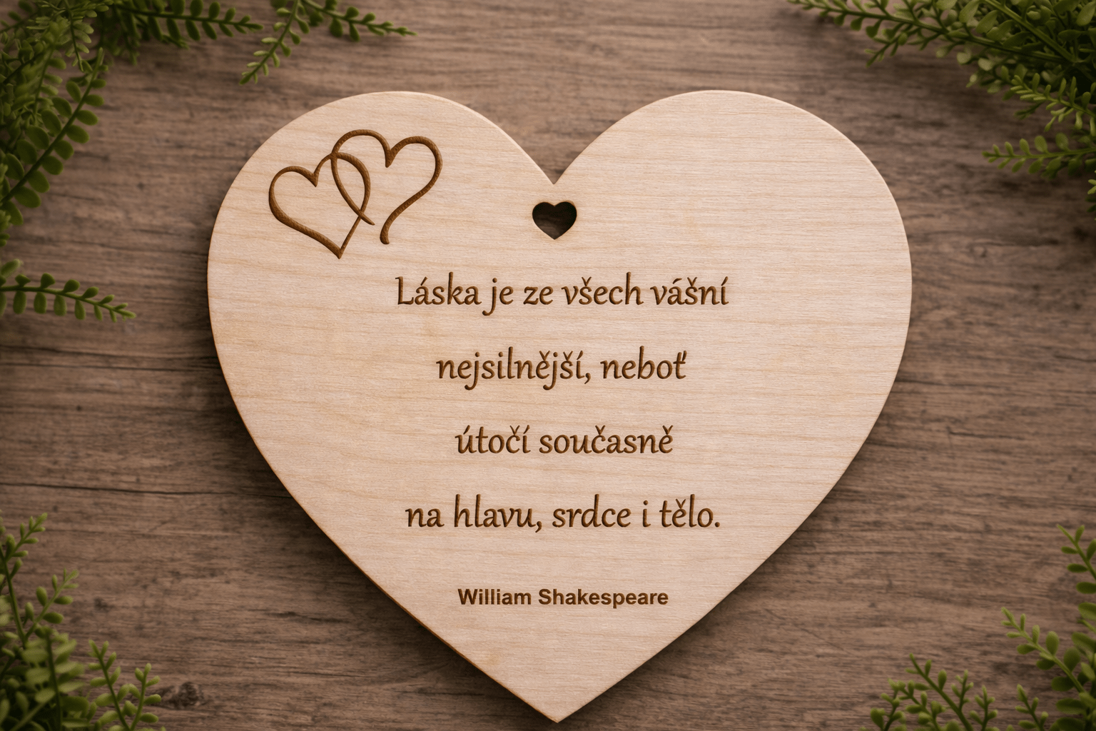 Dřevěné srdce s textem – William Shakespeare.