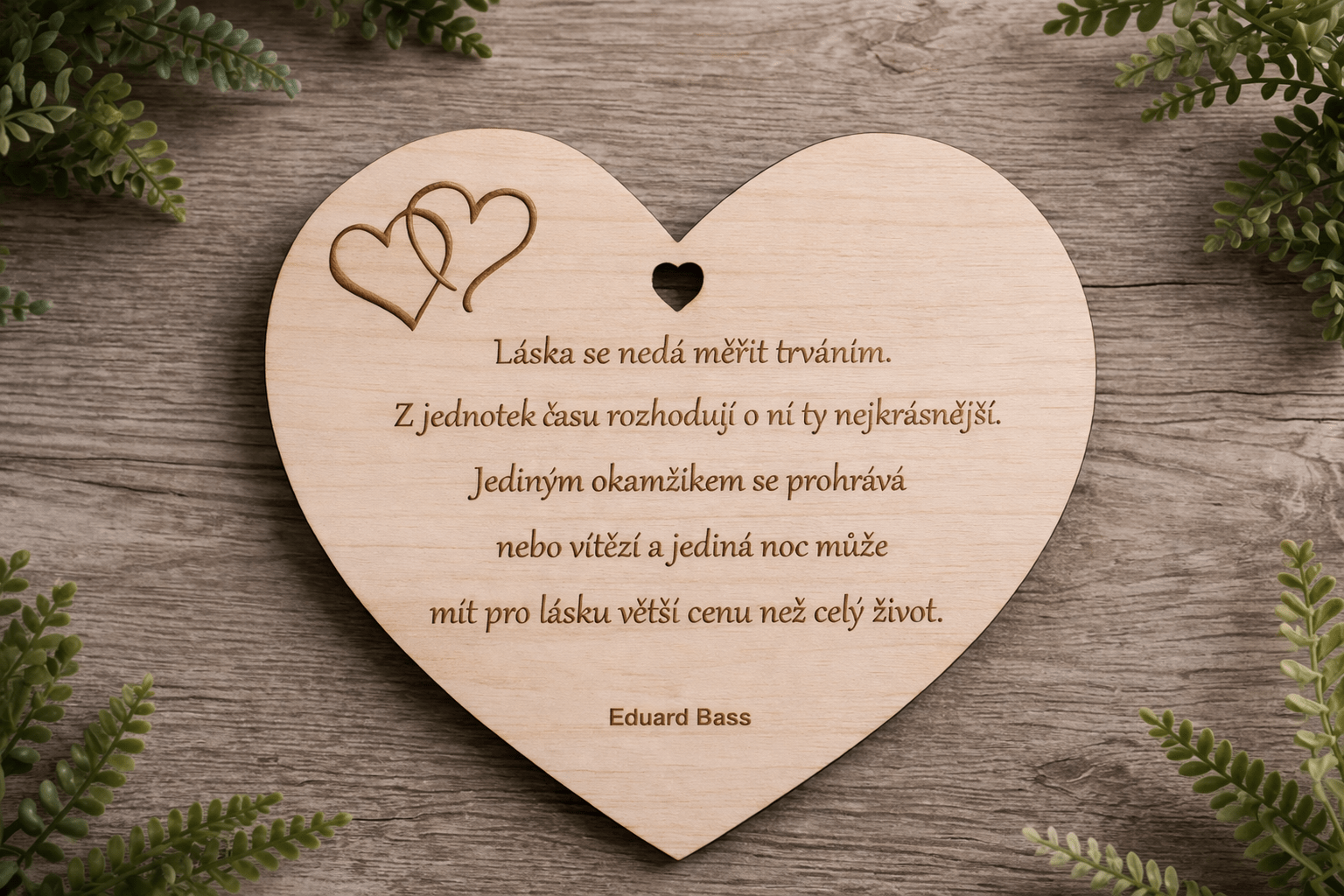 Elegantní dřevěné srdíčko s vygravírovaným citátem od Eduarda Basse je dokonalým doplňkem do vašeho domova nebo jako dárek pro milovanou osobu. Vyrobené z kvalitního dřeva s precizním opracováním, srdce zaujme nejen svým designem, ale i hloubkou poselství slavného dramatika.