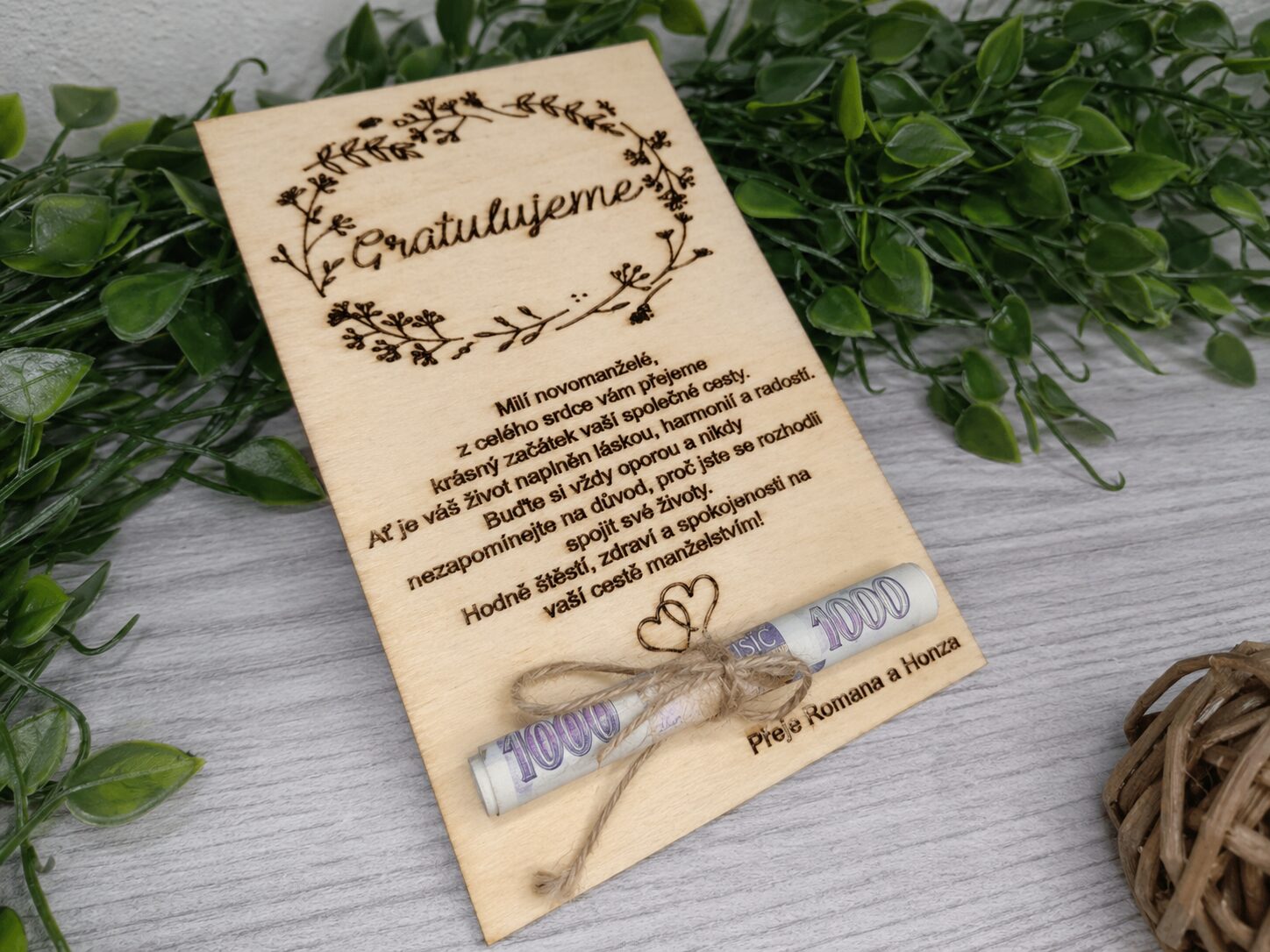 Dřevěné svatební přání na peníze je elegantní a originální způsob, jak předat novomanželům finanční dar. Vyrobeno z kvalitního dřeva, nabízí jedinečný design, který zaujme svou přirozenou krásou a jemnými detaily.