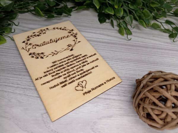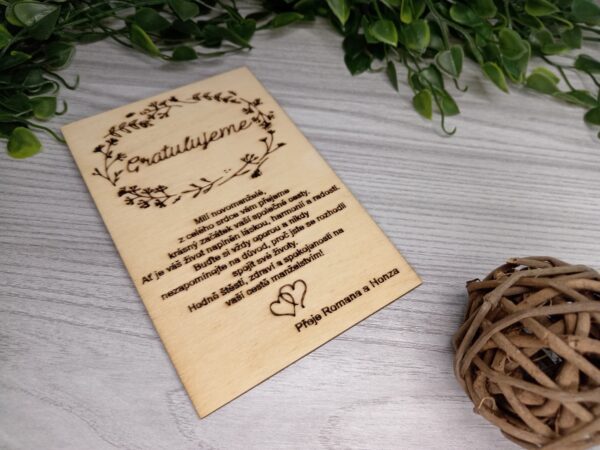 Dřevěné svatební přání na peníze je elegantní a originální způsob, jak předat novomanželům finanční dar. Vyrobeno z kvalitního dřeva, nabízí přání jedinečný design, který zaujme svou přirozenou krásou a jemnými detaily.