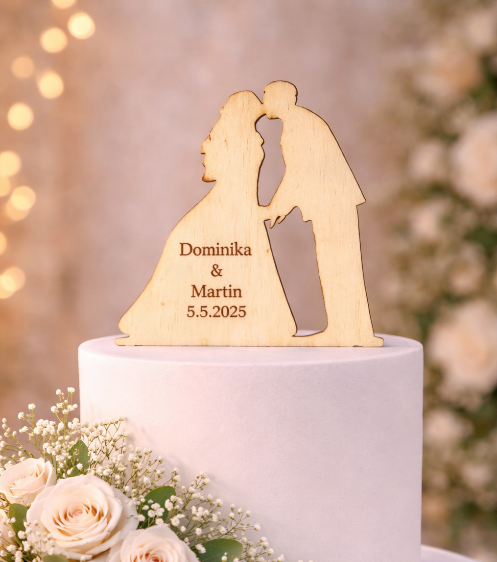 Dřevěný zápich na dort- vlastní text 20×13,5cm tato krásná dekorace je ideální pro zdobení svatebního dortu a vytvoření nezapomenutelné atmosféry.